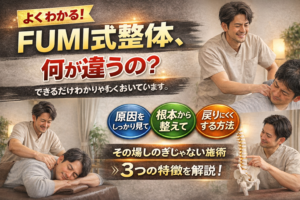 「FUMI式整体って、普通の整体と何が違うんですか?」 これ、実はよく聞かれます。初めて来てくださる方も、気になっている方が多いです。 たしかに、整体って言葉だけ聞くと「揉むの?」「骨を鳴らすの?」「痛いの?」いろんなイ […]